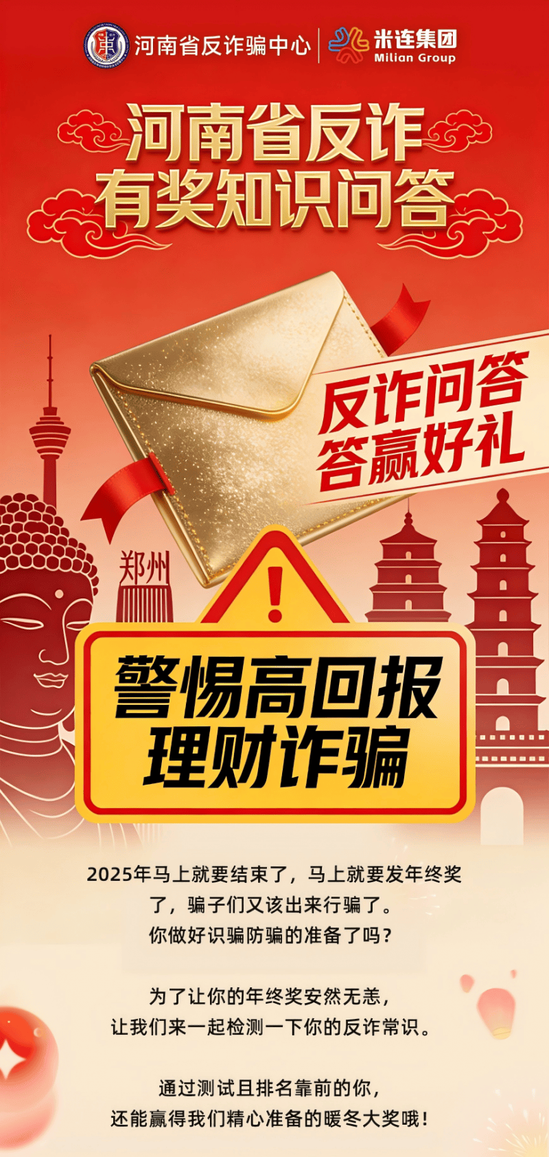 岁末年初,年味渐浓,各类电信网络诈骗案件进入高发期。米连集团为切实增强群众防骗意识,提升全民识诈、防诈、拒诈能力,营造平安祥和的节日氛围,集团联合河南省反诈骗中心于近日发起“反诈有奖知识问答”活动,以趣味互动形式传递反诈知识,再掀全民反诈新热潮。